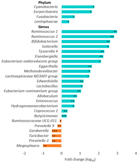 Changes in the relative microbial abundance in the gut after synbiotic intervention. * p < 0.05, ** p < 0.01, *** p < 0.001, as compared with the placebo group at the end of the trial.