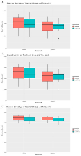 Alpha diversity metrics were used to measure species richness and evenness (similar abundance) in the groups (Figure 3 and Table 2). The number of OTUs, the Chao1 estimator (a measure of community richness) [29], and the Shannon Index (a measure of richness and evenness or entropy) [30] were calculated. The data analysis showed that there were no significant differences in alpha diversity metrics between treatment groups and time points (Figure 3B). The Shannon index pointed to a decreasing trend in microbial diversity at the end of trial in both the placebo and synbiotic groups (Figure 3C). These data suggest that the observed decrease in microbial diversity in the placebo and synbiotic groups at the end of trial implies involvement of other factors, probably, the effect of the high-protein, low-carbohydrate, energy-restricted diet used in this weight loss program.