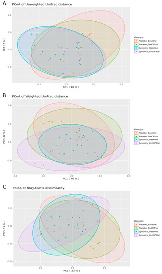 To visually identify whether groups of samples cluster based on similarity to each other, PCoA plots were generated to highlight separation of groups of samples for unweighted UniFrac distance, weighted UniFrac distance, and Bray–Curtis dissimilarity distance (Figure 4). No statistically significant differences in microbial diversity between or within the placebo and synbiotic group at the baseline and end of trial were observed.