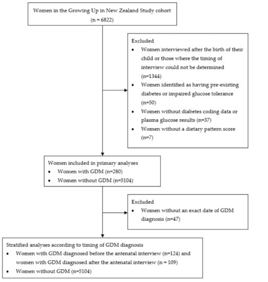 Flowchart showing selection of participants included in primary and secondary analyses of dietary patterns and dietary adaptations in women with and without GDM from the Growing Up in New Zealand study.