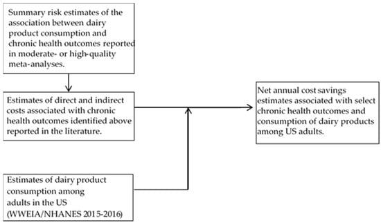 The objective of this study was to quantify the net annual costs, in terms of direct medical costs (i.e., medical encounters, procedures and prescription medications) and indirect costs (mortality and lost productivity) associated with increased intake of dairy products in the US if all adults (20 years and older) were to meet the DGA recommendation of 3 c-eq/day of dairy products []. Both favorable and adverse associations between the consumption of dairy (total dairy, milk, cheese, and yogurt) and health outcomes were included based on a comprehensive review of the current scientific literature. Further, given the DGA’s recommendation to meet these guidelines with low-fat dairy options, where data were available, the associations between health outcomes and low-fat and high-fat dairy were examined in the model.