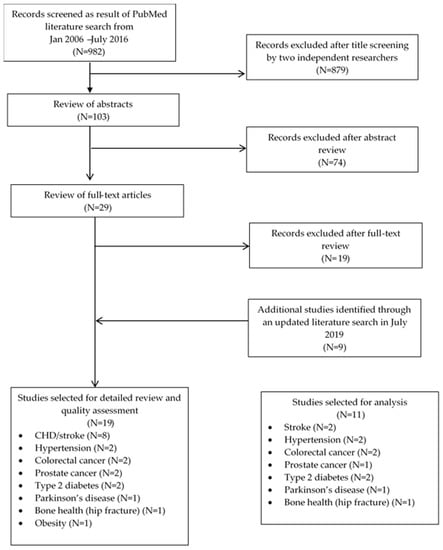 Increased risks of prostate cancer and Parkinson’s disease with dairy consumption were identified. Specifically, in 2018, the WCRF CUP concluded that there was limited evidence showing that high dairy consumption increases the risk of prostate cancer []. This finding is based on a meta-analysis that found statistically significant increased risk of total prostate cancer in a dose–response association with total dairy, milk, and cheese []. The potential for an increased risk for Parkinson’s disease from the consumption of dairy products was based on a 2014 meta-analysis of seven studies []. The meta-analysis relied upon in the Parkinson’s disease review includes seven studies on total dairy and four studies on milk. The association between dairy and Parkinson’s disease is thought to be due, in part, to contaminants, such as pesticides, in milk. However, a recent review supports the possibility that there may be a biological mechanism associated with the urate-lowering effects of dairy products []. Several recent reviews note the limited evidence and speculative hypotheses associated with dairy consumption and prostate cancer and Parkinson’s disease risk [,]. While recognizing the potential for this adverse association, due to the limited evidence, these two outcomes were excluded as part of a secondary analysis in the present study.