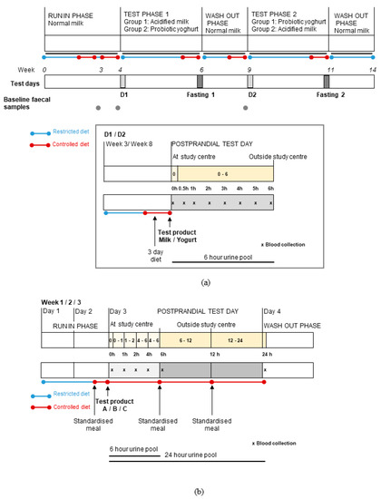 Overview of the study designs used for two randomised, controlled, cross-over trials that compared the postprandial and short-term effects of consuming fermented or non-fermented dairy products (adapted from Burton et al. and Münger et al.) [24,25]. (a) In Study 1, volunteers (n = 14) were assigned to test probiotic yogurt and acidified milk in random order during two test phases. At the beginning of each test phase, postprandial dairy tests (D1 and D2) were conducted while the effects of two-week daily consumption of each product were assessed by fasting tests (Fasting 1 and 2). (b) In Study 2, test products were administered to volunteers (n = 11) in random order (A = milk, B = cheese, C = Soy drink) and their effects were evaluated by postprandial tests. For both studies, on postprandial test days, blood (x) and urine sampling (intervals shown by yellow blocks) was completed as indicated on the schematics. Fasting blood and urine samples were collected on each test day. In Study 1, pre-test faecal samples were collected during the run-in and wash-out phases. Dietary restrictions were applied during the studies with the provision of a three-day controlled diet (Study 1) and a standardised meal (Study 2) before each test day.