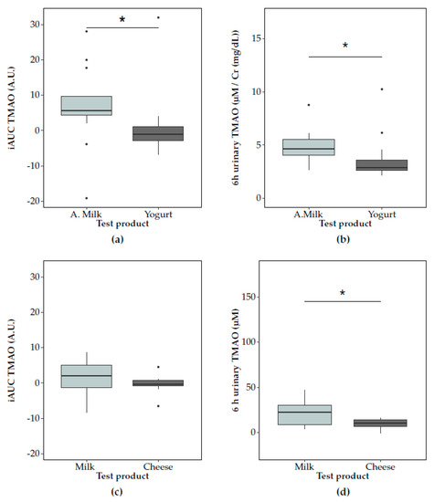 Postprandial trimethylamine-N-oxide (TMAO) responses in plasma (summarised by net incremental area under the curve (iAUC)) and urine after consumption of non-fermented milk (light grey) and a fermented milk product (dark grey) consumption. In Study 1, TMAO responses to acidified milk (‘A.milk’) and yogurt are compared in (a) plasma and (b) urine. In Study 2, TMAO responses to milk and cheese are compared in (c) plasma and (d) urine. The concentrations of TMAO after the dairy products’ tests are compared using the paired Wilcoxon signed-rank test (significance at p < 0.05, indicated by *). Plots show the IQR (box), the median dividing the IQR (―), with whiskers that extend to the last point included in the 1.5 × IQR range and outliers outside this range identified (•).