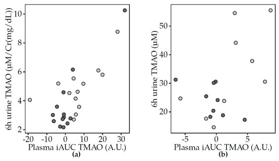 Scatter plots to illustrate the association between the postprandial TMAO changes in plasma (iAUC) and urine (6 h pool) after non-fermented milk (light grey) and fermented dairy (dark grey) consumption. Spearman’s correlation test showed positive associations between postprandial TMAO (iAUC) in plasma and urine (6 h pool) in Study 1 (a) (acidified milk, rho = 0.48, p = 0.02; yogurt, rho = 0.39, p = 5 × 10−5) and after milk consumption in Study 2 (b) (milk, rho = 0.52, p = 0.15; cheese, rho = 0.11, NS). Significant associations at p < 0.05. iAUC, incremental area under the curve; TMAO, trimethylamine-N-oxide; Cr, creatinine.