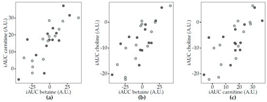 Scatter plots to illustrate associations between the postprandial responses (iAUC) in plasma of selected circulating metabolites to acidified milk (light grey) and yogurt (dark grey) consumption (Study 1). Spearman’s correlation test completed for acidified milk and yogurt (significance for FDR < 0.05) showed positive correlations for (a) carnitine and betaine (acidified milk, rho = 0.87, FDR = 0.003; yogurt, rho = 0.74, FDR = 0.03), (b) choline and betaine (acidified milk, rho = 0.84, FDR = 0.003; yogurt, rho = 0.63, FDR = 0.05) and (c) choline and carnitine (acidified milk, rho = 0.80, FDR = 0.003; yogurt, rho = 0.58, FDR = 0.06). A.U., arbitrary units; FDR, false discovery rate; iAUC, incremental area under the curve.