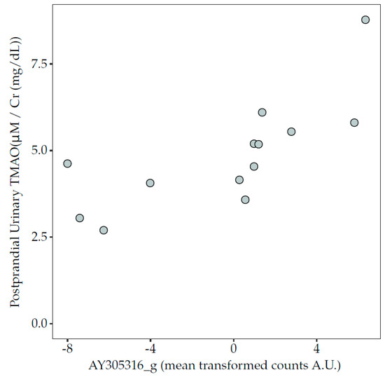 A significant positive association was observed between an uncharacterised genus of the Lachnospiraceae family, AY305316_g (CAG-81 in GTDB), and the 6 h postprandial urinary TMAO concentrations after acidified milk consumption (Figure 5). An inverse trend was also observed between 6 h postprandial urinary TMAO concentrations after acidified milk consumption and the class Lentisphaeria (rho = −0.65, p = 0.03, FDR = 0.19). Conversely, no significant associations were observed between postprandial circulating TMAO after acidified milk and microbiota taxa. No associations were observed between TMAO plasma or urinary concentrations in fasting or postprandial conditions and the pooled abundance of all taxa predicted to express the cutC gene (p > 0.05).