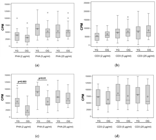 Lymphocyte proliferation was measured in culture containing 5% FBS or HS in response to PHA or CD3/CD28 stimulation. Contrary to what has been previously observed in young and older subjects with healthy weight [4,5], there was no age-related difference in proliferation of lymphocytes cultured in FBS under any stimulation condition tested (Figure 1a,b). However, higher lymphocyte proliferation was found in the YG when PBMC were cultured in medium containing HS and stimulated with PHA (at 2 μg/mL and 5 μg/mL) (Figure 1c).