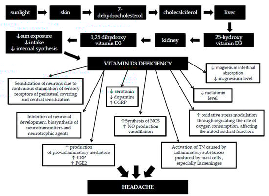 In 2010, Prakash noticed that headache prevalence, including migraine, increase with increasing latitude [37]. Data also indicated that in autumn–winter frequency of headache attacks grow, while in summer, number of attacks decrease [37]. This pattern of headaches appears to match the serum vitamin D levels seasonal variations; however, the exact relationship between vitamin D deficiency and headache is somewhat enigmatic. Finding the link between vitamin D and migraine is made even more difficult due its complex pathophysiology, including metabolic, genetic, and hormonal elements that influence on the ability of the brain to process incoming sensory information [38]. Therefore, there are a number of ways by which vitamin D may influence primary headaches like migraines.