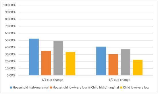 As shown in Figure 1, when considering caregiver-reported household food security measures, 23 children (52.3%) who lived in households with high/marginal food security increased daily whole fruit consumption by at least ¼ cup, compared to 15 children (34.9%) who lived in low/very low food security households (p = 0.102). When considering child-reported feelings of food security, 17 children (48.6%) who reported high/marginal food security increased daily whole fruit consumption by at least ¼ cup, compared to six children (33.3%) who reported low/very low food security (p = 0.289).