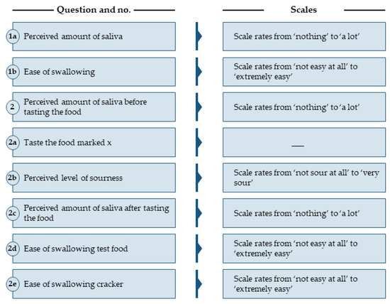 From questions 1a and 1b (Figure 1), we created a baseline by asking the participants to determine the perceived amount of saliva in their mouths before tasting a cracker and how easy it was to swallow the cracker. In addition, pH was measured in duplicate using a pH-meter (Mettler Toledo, EL20, Columbus, OH, USA).
