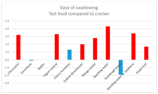 The results (Table 1) showed that all of the test foods were easier to swallow than the test cracker, except for cornichons and sourdough bread, where the values were negative compared to the baseline. All of the test foods, except for the two previously mentioned and cherry tomatoes, were significantly (p ≤ 0.05) easier to swallow than the test cracker (Figure 2).