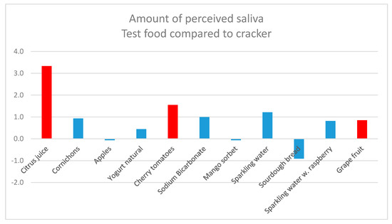 The perceived amount of saliva compared to the baseline cracker is shown in Figure 3. All of the test foods, except for sourdough bread, apples, and mango sorbet, increased the perceived amount of saliva. However, as = seen in Figure 3, only three of the test foods, namely, citrus juice, cherry tomatoes, and grapefruit, increased the perceived amount of saliva significantly (p ≤ 0.05). When comparing the test foods to each other, citrus juice increased the perceived amount of saliva significantly (p ≤ 0.05) more than all the other test foods (Table 1).