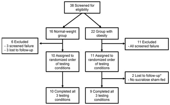 Thirty-eight potential participants (16 normal-weight participants and 22 participants with obesity) enrolled in the study. Of those 38, 14 failed screening, three were lost to follow up after their screening visit, and two did not complete one of the study visits (Figure 1). There were no significant differences in age, sex, or fasting plasma glucose concentrations between weight groups (Table 1). However, mean fasting plasma insulin concentrations and HOMA-IR2 were significantly higher in the group with obesity than in the normal-weight group (Table 1).