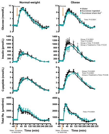 To determine the statistical significance of the effect of tasting or tasting and ingesting sucralose on plasma glucose, insulin, C-peptide, and GIP concentrations, as well as glucose kinetics (Total Ra, oral glucose rate of appearance, and EGP), ISR, SI, and insulin clearance during the OGTT, and to determine the effect of obesity on plasma sucralose concentrations, we used the general linear mixed model (PROC MIXED) analysis with subject-level random intercepts. Treatment (water, sucralose, and sham-fed), time (when applicable), and weight group (normal weight and obese), as well as all interactions (when applicable) were included in the model and treated as fixed effects. When differences in values were statistically significant, post hoc Fisher least significant difference analyses were conducted. Because the PROC MIXED analysis can handle unbalanced designs, data from two participants in the group with obesity who did not complete the sucralose sham-fed visits were also included (therefore, for the group with obesity PROC MIXED analyses included data on 11 participants for sucralose and water treatment and 9 participants for sham-fed). Data in the tables and figures are presented as the mean ± SEM unless otherwise stated. All analyses were performed with SAS 9.3 (SAS Institute, Cary, NC, USA), and criterion for statistical significance was p ≤ 0.05.