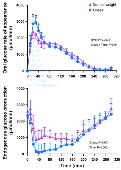 Participants with obesity had a higher oral glucose rate of appearance during the first 40 min of the OGTT than normal-weight participants (Weight Group × Time: F(11,209) = 1.88, p = 0.04; Figure 3); however, the iAUC of total glucose rate of appearance and of oral glucose rate of appearance were similar between weight groups (Table 2). Glucose ingestion suppressed EGP rapidly in both groups (p < 0.0001), but more so in participants with obesity (p = 0.018; Figure 3). Sucralose, ingested or sham-fed, did not affect the total glucose rate of appearance (Figure 1) or the oral glucose rate of appearance in either weight group (Figure A5 in Appendix B). For all treatments, and in both weight groups, the amount of ingested glucose reaching systemic circulation over 5 h was ~70% of the 75 g given (Table 2).