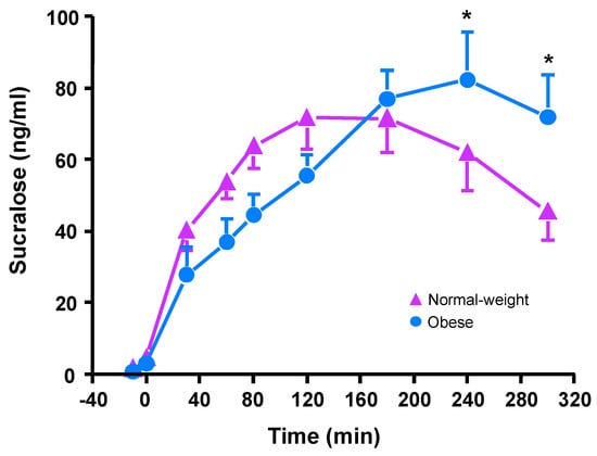 Plasma sucralose concentrations in normal-weight participants (n = 10) and participants with obesity (n = 10) after sucralose treatment prior to ingestion of a 75 g glucose load at time 0 min. The general linear mixed model (PROC MIXED) analysis with subject-level random intercepts was used. Time and weight group (normal weight and obese), as well as the interaction, were included in the model and treated as fixed effects. Post hoc Fisher least significant difference was used when values were statistically significant. * Value for participants with obesity different from normal-weight participants, p < 0.05. All values are the mean ± SEM.