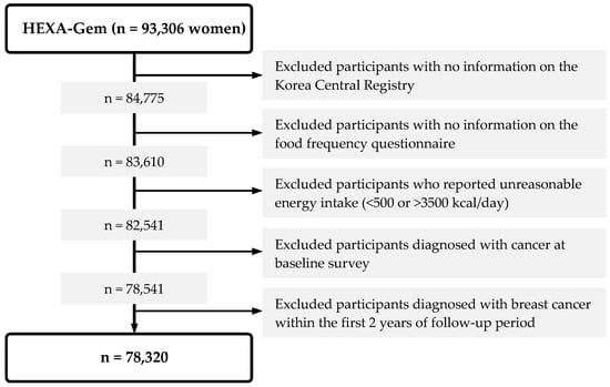 Among the HEXA-G cohort, we excluded participants who had no information on the date and cause of cancer from the Korea Central Registry (n = 8531) and those who did not provide information on food frequency questionnaire (FFQ) (n = 1165). Missing data on FFQ was treated according to the criteria provided by KoGES, which excluded individuals who: (1) did not answer any of the questions in the FFQ; (2) left more than 12 frequency questions blank; (3) did not answer any questions on rice consumption; or (4) had extremely low (<100 kcal/day) or high (≥10,000 kcal/day) energy consumption [26]. Participants were also excluded if they did not have plausible values for total energy consumption (n = 1069; <500 or >3500 kcal/day).