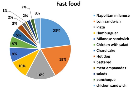 The number of surveys carried out was 486. Table 1 reports the descriptive statistics and the percentages of the survey responses. Of the surveys, 131 (27%) were answered by men (19 to 47 years old) and 355 (73%) by women (20 to 40 years old). More than 70% of respondents showed their concern and interest in healthy eating, however very few of them reported knowing the daily recommended sodium intake. Only 12% admitted having cardiovascular disease. A high percentage responded knowing the difference between salt and sodium. According to the answers obtained, the seven most named foods were selected for each proposed category (street food, fast food and artisanal food) to be analyzed. Figure 1 shows the distribution of all the foods mentioned in each category. It can be seen that some foods were named in more than one category; the highest frequency was selected for its definitive classification. Figure 2 shows the responses on frequency of consumption including the three categories studied. It was adopted to perform some calculations (not shown in this manuscript) 4–6 times per week.