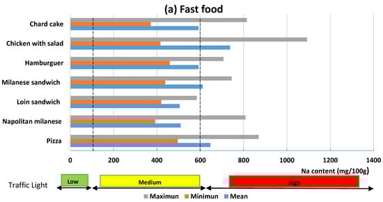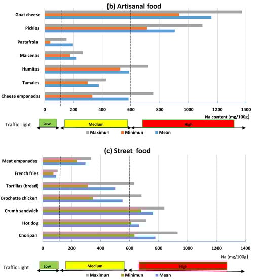 Figure 3a–c shows the average contents, maximum and minimum values by category/subcategory of food. As it can be observed, there is great variability for each subcategory. If the sodium contents of the total foods analyzed are compared with those established by traffic light, it can be observed that only French fries can be classified as low sodium (≤120 mg Na). Among the medium-content foods (>120 and <600 mg of sodium), there are four foods from the fast food category, five artisanal foods and three of street-sale food. All other foods analyzed are classified as high in sodium (≥600 mg Na/100 g).