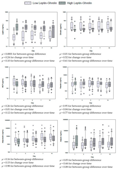 Serial measurements for leptin, ghrelin and other adipokines in patients with low and high leptin/ghrelin ratio at baseline. The differences between groups, with time and between groups with time (group × time) were tested by repeated measures mixed linear models. Box plots are displayed with medians and quartiles 1 and 3. The error bars refer to 10th and 90th percentiles.