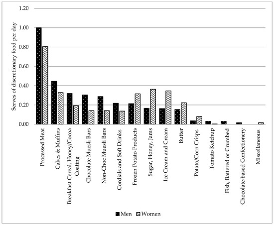 Discretionary food consumption was 3.22 ± 0.21 serves per day, with men 3.38 and women 3.09 serves per day. Foods contributing most to the discretionary category were processed meat (predominantly ham), potato products (predominantly fries), sugary breakfast cereal (cocoa or honey coated), sweetened and savory biscuits, cakes, muesli and cereal style bars (chocolate coated or non-chocolate coated), sugar, honey, jam, and cordial (regular and low kilojoule varieties). Figure 2 shows serves per day consumed for several types of discretionary food by men and women from the study.