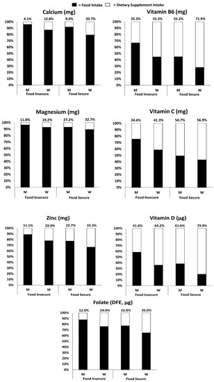 Relative contribution of foods/beverages and dietary supplements to total usual intakes for selected nutrients by age group among men and women by food security status (≥19 years) in the U.S., 2011–2014. 1 (1 The analytic sample includes individuals ≥19 years old that were not pregnant or lactating with complete information for food security and the day 1 and 2, 24 h dietary recalls. Percentages above each bar represent the relative contribution from dietary supplements). Abbreviations: M, Men; W, Women; DFE, Dietary Folate Equivalents.