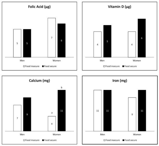 Estimated percent (%) of total micronutrient intakes above the Tolerable Upper Intake Level (UL) by food security status among adult (≥19 years) supplement users in the U.S., 2011–2014. 1,2 (1 The analytic sample includes individuals ≥19 years old that were not pregnant or lactating with complete information for food security and the day 1 and 2, 24 h dietary recalls. Numerical data labels within each bar represent the estimated proportion (%) of U.S. adult supplement users with intakes greater than the UL. 2 Different superscript letters denote a significant difference between food security categories within sex at a p-value < 0.0125.).