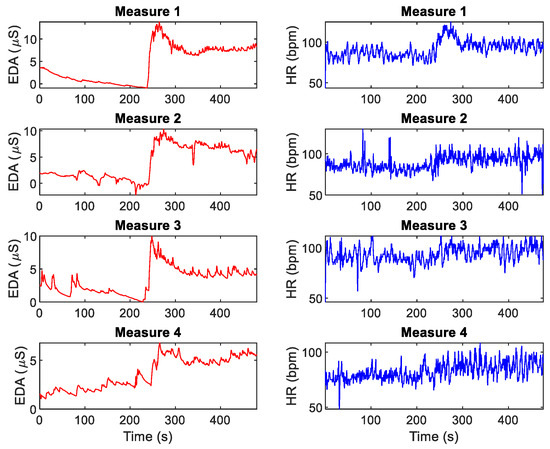 Figure 1 shows the EDA and heart rate (HR) data for Measures 1–4 for a given subject. Table 5 includes the results for the rest and test stages of the Stroop task measurements over three days of tests (four measurements in total). SCL, NS.SCRs, EDASympn, TVSymp, PRVLFn and PRVHFn were normally distributed. EDASymp, PRVLF and PRVHF were non-normally distributed. Test vs. rest significant differences of the indices are marked in the table. The only index that exhibited consistently significant differences was TVSymp. The other indices exhibited variability in their rest-to-test increments.