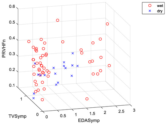 Only the combination of indices and machine learning models that achieved the highest accuracy for the four possible data types (i.e., only rest, only test, rest-to-test increments, both test and rest measures) were included. When only rest measures were used (e.g., data from the test stage of the Stroop task were not used), SE-KNN achieved an accuracy of 91.2% by using EDASymp, TVSymp and PRVHFn in classifying “dry”/“wet” classes (Figure 2 shows the scatterplot for this specific combination of indices). Note that the dataset looks imbalanced in Figure 2 because the up-sampled “dry” samples fell on top of the other “dry” samples. The same “dry”/“wet” classification accuracy (91.2%) was achieved by using the Cubic SVM classifier with the only test values (i.e., no data were collected during the rest stage of the Stroop task) of the NS.SCRs, EDASymp, EDASympn, PRVLF, PRVLFn and PRVHFn indices. This cubic SVM model was the best in overall, as its error rate was the lowest (8.8%), its sensitivity (100%) was the highest, and its specificity (88.2%) and precision (73.9%) were high. A slightly lower “dry”/“wet” classification accuracy was achieved when rest-to-test increments (i.e., difference between PRV and EDA values from the rest-to-test stages of the Stroop task) were used in the KNN model (86.8%) with SCL, NS.SCRs, TVSymp, PRVLF, PRVLFn and PRVHFn. An accuracy of 86.8% was reached when both rest and test measures were used in a quadratic discriminant analysis (QDA) classifier. Remarkably, this model exhibited a specificity of 98% and a precision of 90%, the highest overall. This means this model detected the “wet” samples almost unequivocally. However, it had a rather low sensitivity (52.9%).