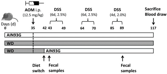 One group received exclusively the AIN93G diet (AIN group, eight animals) while another received only the WD (WD group, nine animals) throughout the experimental period. The third group was maintained on the WD for 42 days before the diet was switched to the AIN93G diet (WD/AIN group, eight animals) one day before the start of the first DSS cycle (MP Biomedicals, Solon, OH, USA). After 35 days feeding either WD or AIN93G diet, the mice received 12.5 mg/kg AOM (Sigma Aldrich, St. Louis, MO, USA) via intraperitoneal (i.p.) injection to induce tumorigenesis. The mice were treated with three cycles of DSS (first and second cycle DSS: Six days, 2.5% per cycle, third cycle: Four days, 2% DSS), added to autoclaved tap water to induce inflammation for tumor promotion. The mice were euthanized 28 days after the end of the third DSS cycle, on day 117 (Figure 1). Blood was collected via heart puncture. Kidney, liver, spleen, and colon were removed. The colon was rinsed in ice–cold phosphate-buffered saline (PBS) and 0.5 cm from each end was cut and snap frozen in liquid nitrogen. The remaining colon was rolled into a Swiss roll [35], fixed in 4% formaldehyde-PBS, and subsequently paraffin-embedded. Livers and kidneys were cut into two halves for snap freezing and paraffin-embedding as described above.