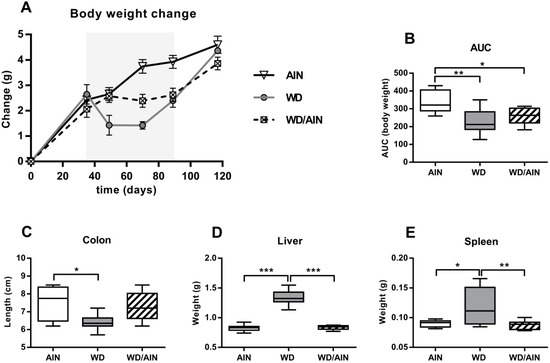 Effect of the WD on macroscopic changes (A) Body weight loss during the period of AOM/DSS administration (grey-shaded area). Day 0: Start of AIN93G or WD feeding, day 35: AOM i.p., day 49: End of first DSS cycle, day 70: End of second DSS cycle, day 89: End of third DSS cycle, and day 117: Day of sacrifice. Body weight of each mouse was set relative to day 0. Mean ± SEM, (B) Body weight changes based on the analysis of the area under the curve (AUC) during the whole experimental period of 117 days. (C) Effect of the diet on colon length, (D) liver, and (E) spleen weight measured on the day of sacrifice. n = 8, median, interquartile range, and whiskers (min to max); ANOVA with Tukey post-hoc test; * p < 0.05, ** p < 0.01, and *** p < 0.001.