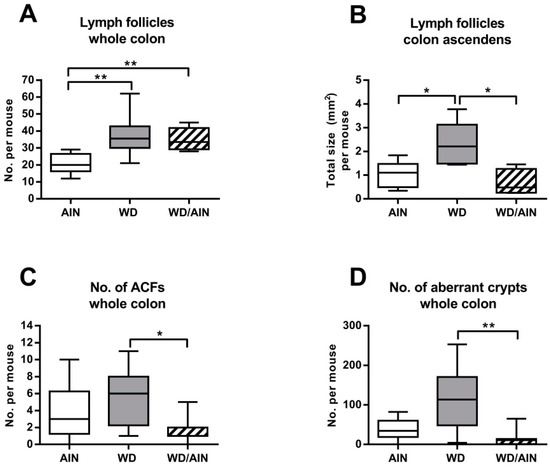 Effect of the diet on the (A) number (n = 7–8), and (B) size of colonic lymph follicles (n = 4–5), ANOVA with Tukey post-hoc test. Effect of the diet on (C) number of aberrant crypt foci (ACFs), ANOVA with Tukey post-hoc test on log transformed data (n = 7–8). Effect of the diet on the (D) number of aberrant crypts (n = 7–8), Kruskal Wallis with Dunn post-hoc test; median, interquartile range, and whiskers (min to max); * p < 0.05, ** p < 0.01.