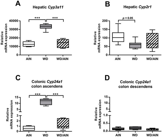 Effect of the diet on mRNA expression of the hepatic (A) Cyp3a11, and (B) Cyp2r1 and on the colonic expression of Cyp24a1 in (C) the ascending and (D) descending colon (n = 4–7). Median, interquartile range, and whiskers (minimum to max). In the WD group of (A,C) one outlier, as determined by Grubbs’ test, was excluded from the analysis. ANOVA with Tukey post-hoc test; *** p < 0.001.
