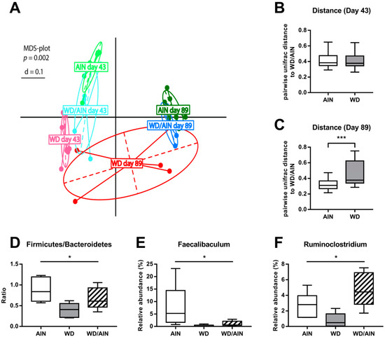 Effect of the diets on the microbiome. (A) Multi-dimensional scaling plot of fecal samples from day 43 (first day after diet switch) and from day 89 (47th day after diet switch), (B,C) pairwise UniFrac distances between the WD/AIN group and the AIN and WD groups, respectively. Effect of the diets on day 89 on the: (D) Firmicutes/Bacteroidetes ratio, (E) relative abundance of Faecalibaculum, and (F) relative abundance of Ruminoclostridium. * p < 0.05, *** p < 0.001.