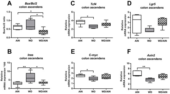 Effect of the diet on the mRNA expression of genes involved in apoptosis, survival, inflammation (A,B) and of genes of the Wnt pathway (C–F) in colon ascendens. n = 4–8 (A–E), n = 5–8 (F) median, interquartile range, and whiskers (min to max); ANOVA with Tukey post-hoc test (A–E) or Kruskal Wallis with Dunn post-hoc test (F), * p < 0.05, ** p < 0.01.