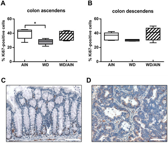 Effect of the diet on proliferation of colonic crypts. Ki67-positive cells in untransformed crypts of (A) colon ascendens and (B) descendens. For each animal, three regions consisting of two to five crypts were chosen and the total number of Ki67-positive and of Ki67-negative cells were determined. n = 4–6; median, interquartile range, and whiskers (min to max); in the WD group of (A) one outlier, as determined by Grubbs’ test, was excluded from analysis; and ANOVA with Tukey post-hoc test, * p < 0.05. Representative pictures of Ki67 (brown) staining (C) in the untransformed mucosa of the WD/AIN group and (D) in a tumor of the WD group. Color and contrast of the images (C,D) were non-linearly enhanced for purpose of presentation only, scale bars = 100 µM.