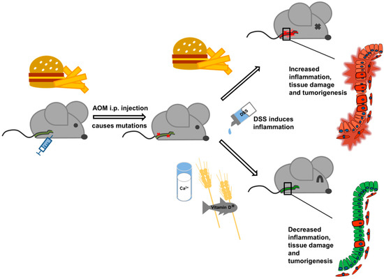 The AOM/DSS model is widely used for studying colitis-associated cancer. AOM causes the genetic injury and the constant regeneration needed after the DSS-induced tissue injury is the promoting impulse for tumorigenesis [59]. Feeding the mice the WD perturbed the regeneration process, mainly in the ascending colon by reducing proliferation and expression of Wnt target genes. These findings were unexpected, as several studies reported the opposite [61,62]. Nevertheless, in a recent study in DSS-treated mice, reduced mucosal proliferation promoted the development of colonic dysplasia [63]. Our group has also shown that feeding a low vitamin D diet increased tumorigenesis in an AOM/DSS mouse model but simultaneously decreased expression of Ki67 in untransformed colonic mucosa [64]. The severity of IBD seems to correlate with vitamin D deficiency [65] and low levels of vitamin D are a feature of Western diet [66]. However, it is probably never a single nutrient of importance, but the interaction among several nutrients is more effective in counteracting IBD and tumorigenesis.