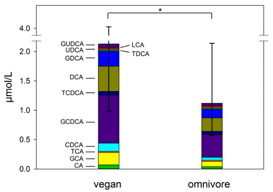 Serum bile acids concentrations in vegans and omnivores of the RBVD study (µmol/L). Data are presented as medians and IQR for total serum bile acids. Mann–Whitney U test was used for bile acids (* p ≤ 0.001). CA = Cholic acid, GCA = glycine-conjugated CA, TCA = taurine-conjugated CA, CDCA = Chenodeoxycholic acid, GCDCA= glycine-conjugated CDCA, TCDCA = taurine-conjugated CDCA, DCA = Deoxycholic acid, GDCA = glycine-conjugated DCA, TDCA = taurine-conjugated DCA, UDCA = Ursodeoxycholic acid, GUDCA = glycine-conjugated UDCA, LCA = Lithocholic acid.