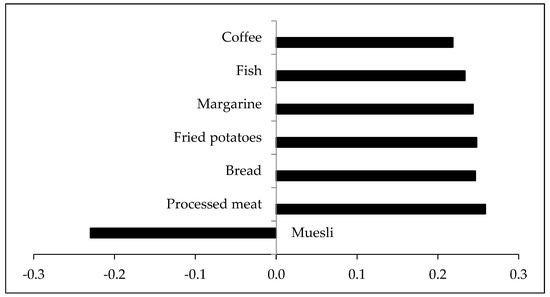 The first reduced rank regression-derived dietary pattern explained 47.4% of the variance in bile acids, mostly driven by the explained variance in glycine-conjugated bile acids (69.1%) and taurine-conjugated bile acids (54.8%). This pattern consisted of positive loadings for coffee, fish, margarine, fried potatoes, bread, and processed meat, and a negative loading for muesli (Figure 3). Factor loadings of all food groups are presented in Table S4 (Supplementary Materials).