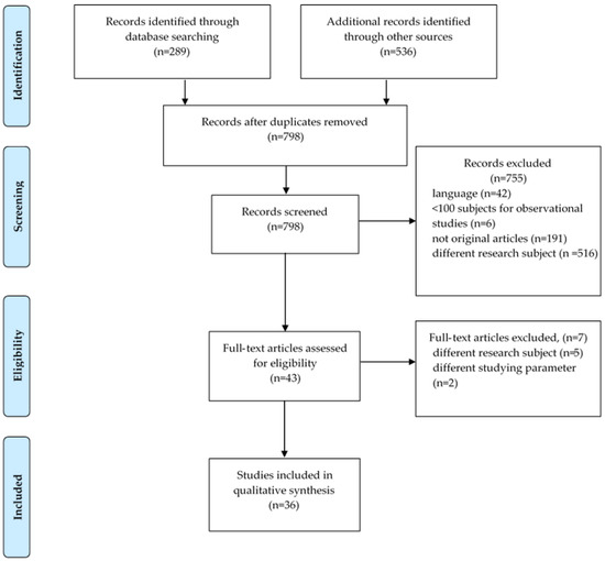 Eight hundred and twenty-five (825) citations were identified through a systematic search—of which, 782 were excluded on the basis of title/abstract. The most common exclusion criteria were: language (42), duplicates—same cohort (27), different research subject (516), not original articles (191), sample size <100 subjects for observational studies only (6). Forty-three (43) articles were then assessed for eligibility and five were excluded due to irrelevant research subject and two due to different studying parameter (Na/K ratio). As a result, the number of articles that met the inclusion criteria and were included in this study were 36 (Figure 1).