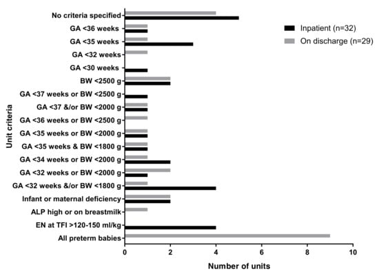 Most units did not routinely prescribe other additional vitamins or minerals, likely due to nutritional products meeting current nutritional recommendations and a lack of level 1 evidence for further supplementations in preterm infants. Four units (15%) prescribed enteral vitamin E, in addition to fortified feeds. A 2003 Cochrane database review did not support the routine use of high-dose vitamin E given intravenously due to increased late-onset sepsis []. No large, randomized controlled trials on enteral vitamin E supplementations and clinical outcomes have been conducted.