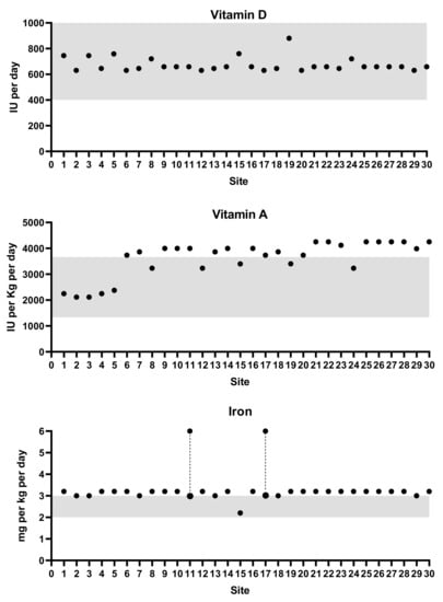 Preterm infants are at high risk of micronutrient deficiencies due to maternal deficiencies, low body stores at birth, and low nutritional intakes, such that most preterm infants require vitamin supplementations soon after birth []. With the exception of vitamin D, the intake of most micronutrients is met by fortified breast milk and preterm infant formula feeds at enteral feed volumes greater than 150 ml/kg/day. Whilst similar amounts of vitamins and minerals are generally provided by most commercial preterm nutritional products, individual requirements may vary significantly depending on gestational ages, stores at birth, and clinical factors.