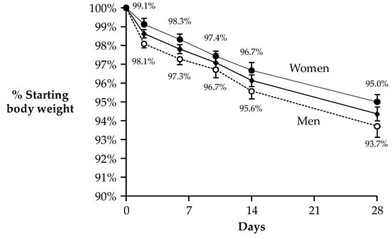 Body weight loss (WL) over 4 weeks of a low-carbohydrate (low-CHO), energy restricted diet. Data are mean ± SE and reported for N = 19 subjects who had complete data for food cravings. Analysis of body WL over time revealed significant effects for men and women combined (center line, with diamond symbols) and also separately for the sexes. WL in men (dotted line with open circles) was significantly greater than in women (top line with closed circles, p = 0.002, ANOVA effect of sex). This figure is modified from Syed-Majid et al. [30] with permission.