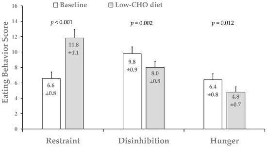 Dietary restraint was significantly increased (~102 ± 21%) from baseline to week 4 after the low-CHO diet, while both disinhibition (~17 ± 7%) and hunger scores were significantly reduced (22 ± 9%) from baseline to week 4 in the entire cohort (Figure 4). No significant main effect of sex was found for any of the three TEFQ subscales (p > 0.05).