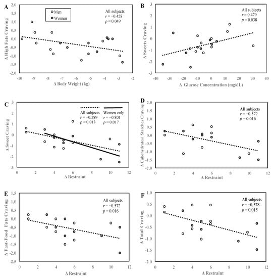 Relationships between craving scores, body weight, glucose concentrations, and eating behaviors. Correlations between change in high-fat cravings and change in body weight (A), change in sweet cravings and change in blood glucose concentration (B), and change in sweet, CHO/starches, fast-food fats, total cravings and dietary restraint (C–F). Change values were calculated by subtracting the value at baseline from week 4. Data are reported for N = 19 subjects that had complete data for cravings, body weight and glucose concentration (A,B) and N = 17 subjects who had complete data for both cravings and TFEQ (C,D). All significance tests were two-tailed.