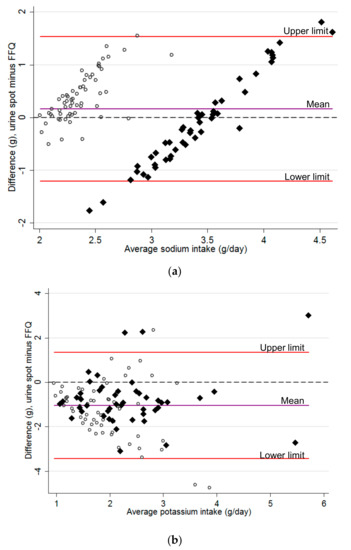 Bland–Altman plot of (a) average sodium and (b) potassium intake based on the intake calculated with a food frequency questionnaire 1 and a morning fasting spot urine in 111 childhood cancer survivors of the SCCSS-Nutrition study. FFQ—food frequency questionnaire; SCCSS—Swiss Childhood Cancer Survivor Study. Y = 0 is the line of perfect average agreement, the hollow circles (○) represent females and the black diamonds (♦) represent males. 1 Sodium (Na) intake based on food frequency questionnaire (FFQ) data was calculated with the equation: (8.20 + 0.38 × FFQ in males)/2.54 and (4.55 + 0.67 × FFQ in females)/2.54, with 1 g Na = 2.54 g salt (NaCl) [25]. Na intake is clustered by sex due to this equation. Intake based on FFQ data only gives a mean daily intake of 1.9 g ± 0.8.