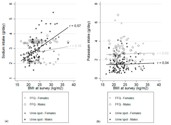 Cardiovascular risk profile B—correlation between BMI and sodium 1 (a) and potassium (b) measurements by food frequency questionnaire (FFQ) and morning fasting spot urine samples. BMI—body mass index; FFQ—food frequency questionnaire. 1 Sodium (Na) intake based on FFQ data was calculated with the equation: (8.20 + 0.38 × FFQ in males)/2.54 and (4.55 + 0.67 × FFQ in females)/2.54, with 1 g Na = 2.54 g salt (NaCl) see [25]. Intake based on FFQ data only gives a mean daily intake of 1.9 g ± 0.8.