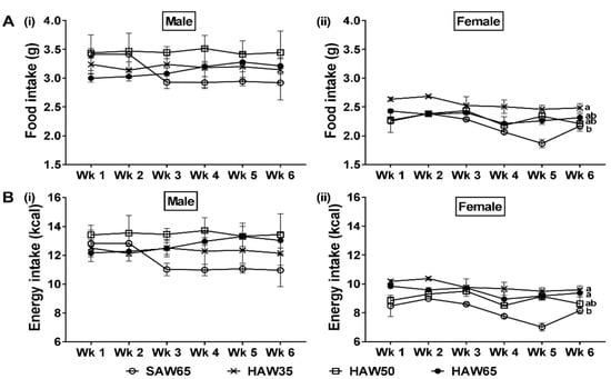 Weekly changes of (A) food intake and (B) energy intake in (i) male and (ii) female mice fed diets containing 65% standard amylose wheat (SAW65), 30% SAW and 35% high amylose wheat (HAW35), 15% SAW and 50% HAW (HAW50) or 65% HAW (HAW65) for six weeks. Data are means ± SEM (n = 8 mice/group). Values with different superscripts indicate significant difference (p < 0.05) by two-way ANOVA followed by Tukey’s post hoc test.