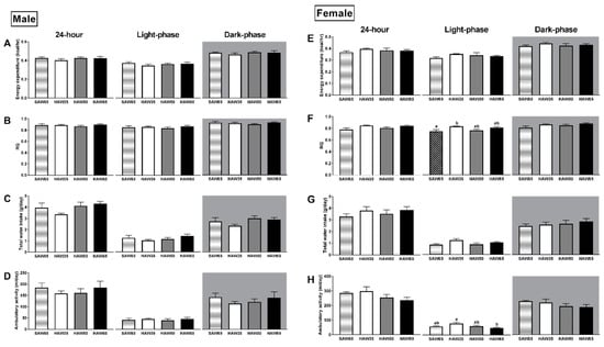 Overall, both males and females exhibited higher energy expenditure, RQ, water intake and ambulatory activity in the dark phase compared to the light phase. In males, there were no differences in energy expenditure (Figure 2A), RQ (Figure 2B), water intake (Figure 2C) or ambulatory activity (Figure 2D) between diet groups. In females, there were no differences in energy expenditure (Figure 2E) or water intake (Figure 2G) between diet groups. However, females consuming the HAW35 diet exhibited a higher RQ compared to the SAW65 group (p = 0.03; Figure 2F) and higher ambulatory activity compared to the HAW65 group (p = 0.02; Figure 2H), during the light phase only.
